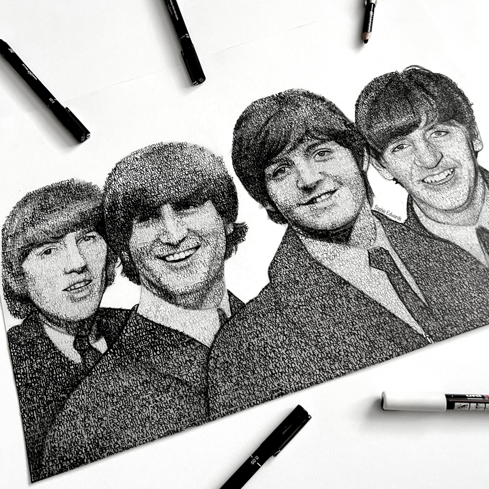 Original drawing of The Beatles completed with writing of The Beatles song titles.